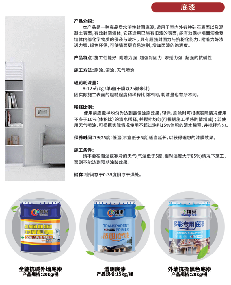 產品特點:施工性能好 附著力強 超強封固力 滲透力強 超強的抗堿性